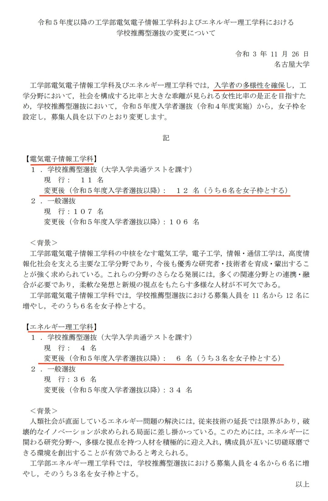 【速報】名古屋大学さん、"多様性の確保"を謳って推薦入試に「女子枠」を追加する 2023年度より pic.twitter.com/cwAdgyQSk6