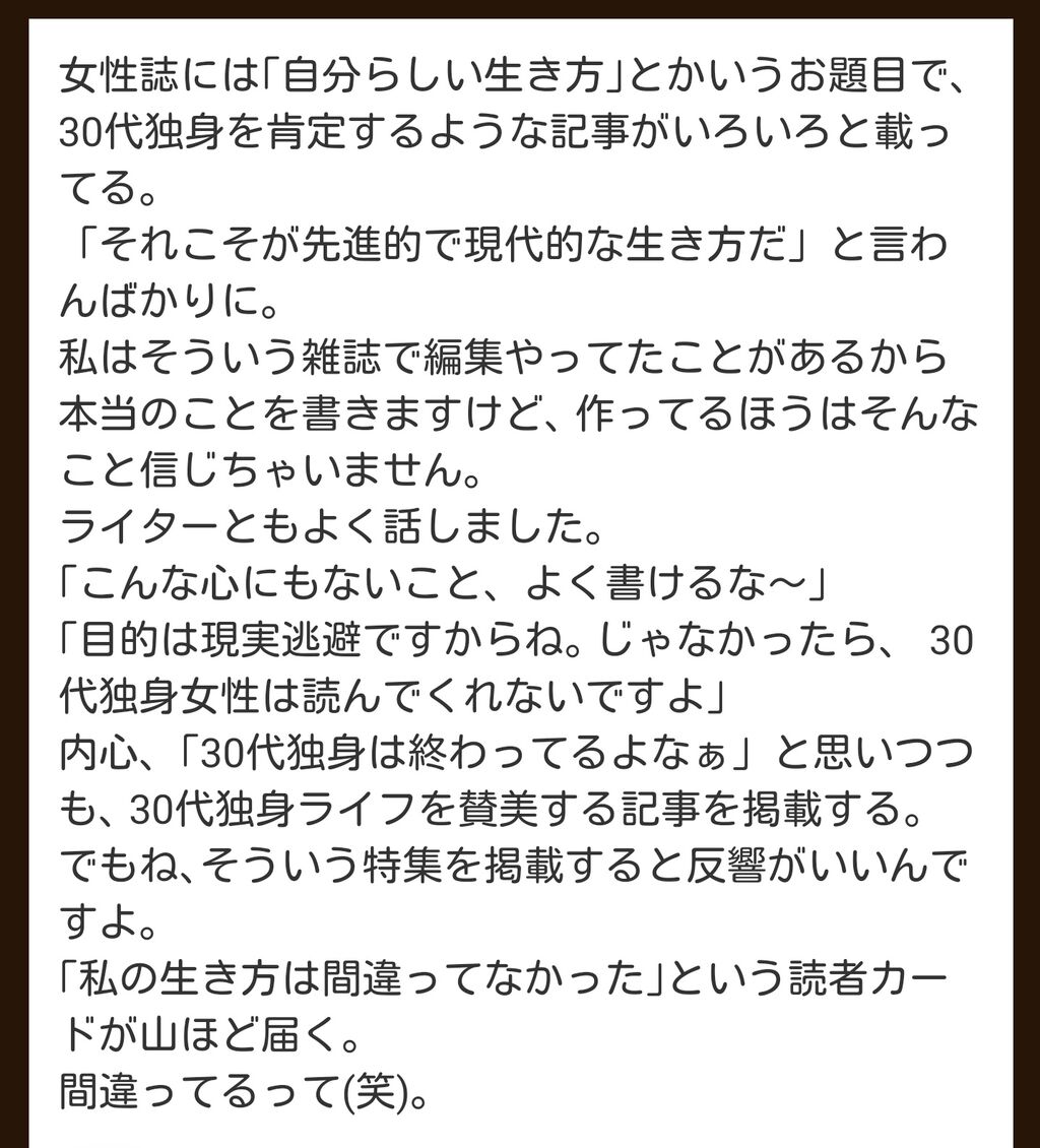 あれ雑誌作ってる方も「新しい時代の女性の生き方wwww“独身女性”の美しさwwwww」って態度だからな