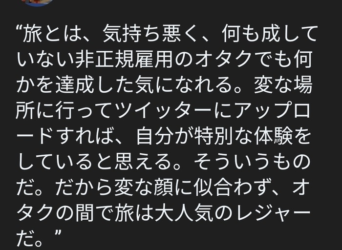 一人旅楽しんでるってやつも、よくよく話聞くと旅先での人との交流を楽しんでるし