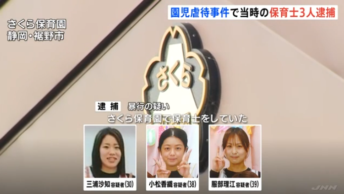 暴行の疑いで逮捕されたのは、裾野市のさくら保育園で保育士をしていた▼沼津市の三浦沙知容疑者(30)、▼裾野市の小松香織容疑者(38)、▼長泉町の服部理江容疑者(39)の3人です。