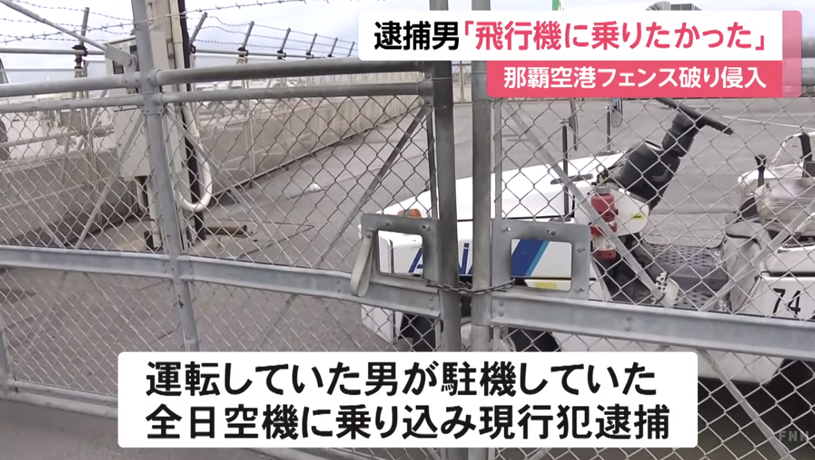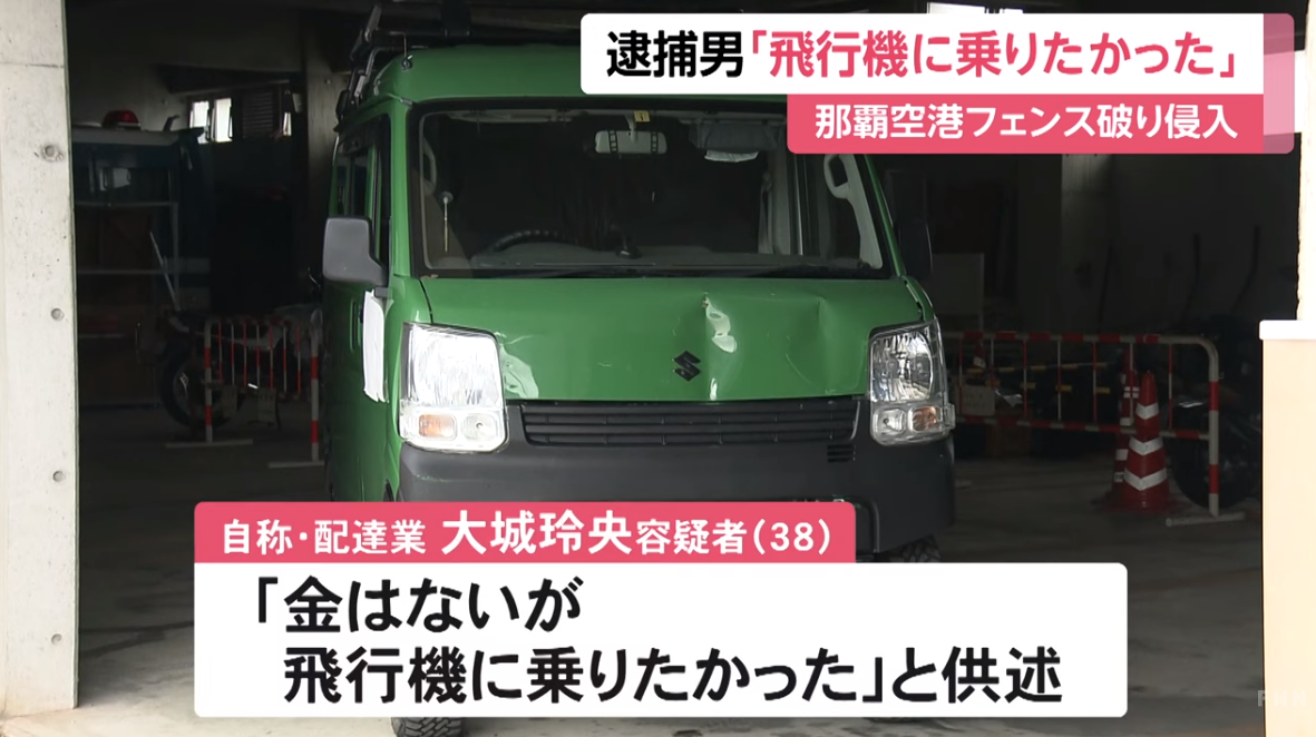 逮捕されたのは自称・配達業の大城玲央(おおしろ・れお)容疑者(38)で「金がないが飛行機に乗りたかった」と供述しているという。