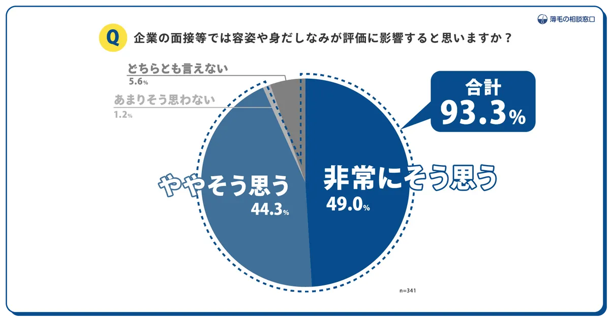 20代~60代の成人男女341名の採用経験者に向けて4月11日〜21日に実施した調査では、まず企業の面接等で容姿や身だしなみが影響すると思うかを質問。その結果、「非常にそう思う」「ややそう思う」が合わせて9割超(93.3%)に。
