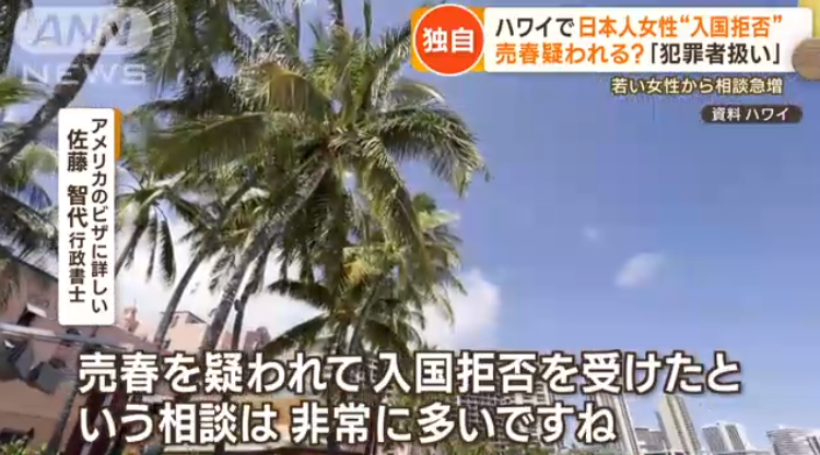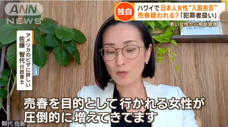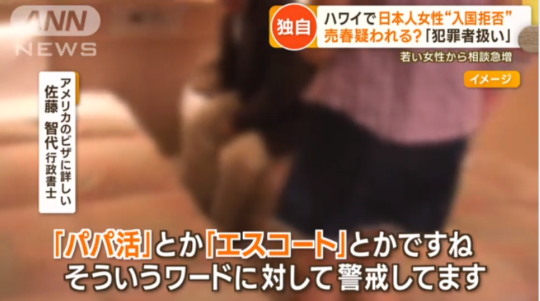 アメリカのビザに詳しい 佐藤智代行政書士:「アメリカに出稼ぎに行かれる、売春を目的として行かれる女性が圧倒的に増えてきてます。それはアメリカ移民局も目をつけていて、『パパ活』とか『エスコート』とかですね、そういうワードに対して警戒してます。ハワイだけではなくてロサンゼルス、ラスベガス、ニューヨークで売春を疑われて入国拒否を受けたという相談は非常に多いですね。(相談が)月に8件とかあった時があって異常事態だなって」