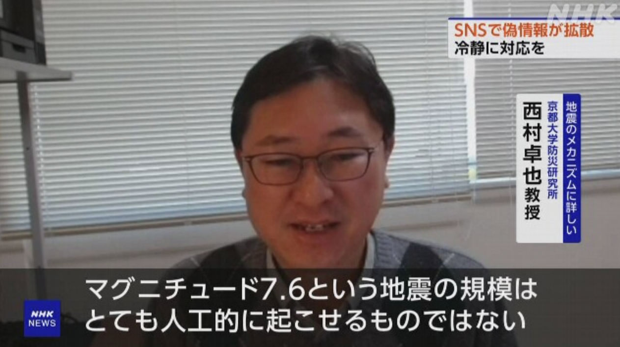 今回の地震や津波に関連して旧ツイッター、Xで地震の原因を「人工地震」だと主張する根拠のない情報が投稿されていることについて地震のメカニズムに詳しい京都大学防災研究所の西村卓也教授は「今回の地震が人工地震であることは考えられない。地震波や地震に伴う地殻変動を見ても一般的な自然の地震と何ら変わらない特徴を持っている。地震は深さは15キロぐらいで起こっているが、例えばその深さまで人間が例えば穴を掘って何かをするのは到底難しく、マグニチュードからみても人間が作り出せるエネルギー量ではない。人工地震では無いと断言できる」と話した上で、「自然に起こる地震なので予測は難しく、引き続き備えを続けてほしい」と話しています。