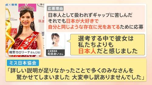 純日本人でも反日的な発言する女性がミス日本になるよりもよっぽどいいと思うよ。