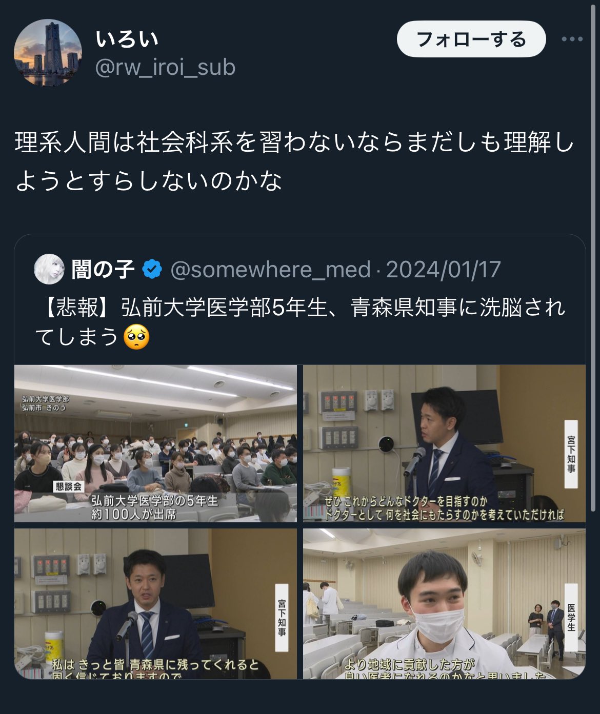そもそも弘前大医は一般枠よりもAOと青森県定着枠定員の方が多くて、同学年の過半数が数年間は青森で医療に従事する
