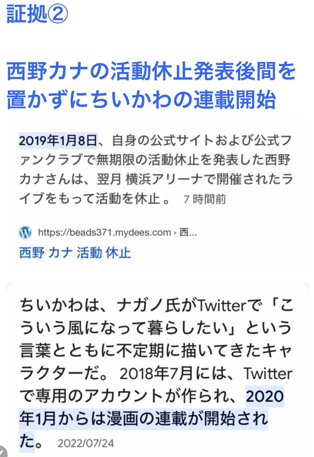 西野が休止宣言したの2019年の1月でちいかわ連載開始は2020年の1月だろ?