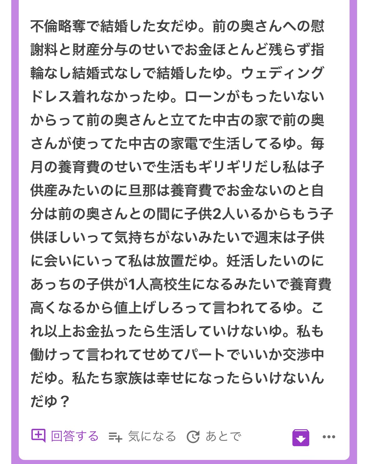 ってか不倫からの再婚なんて一緒にいるだけで幸せなんじゃないの、なんで子供ほしいとか家が中古だとか言ってんの