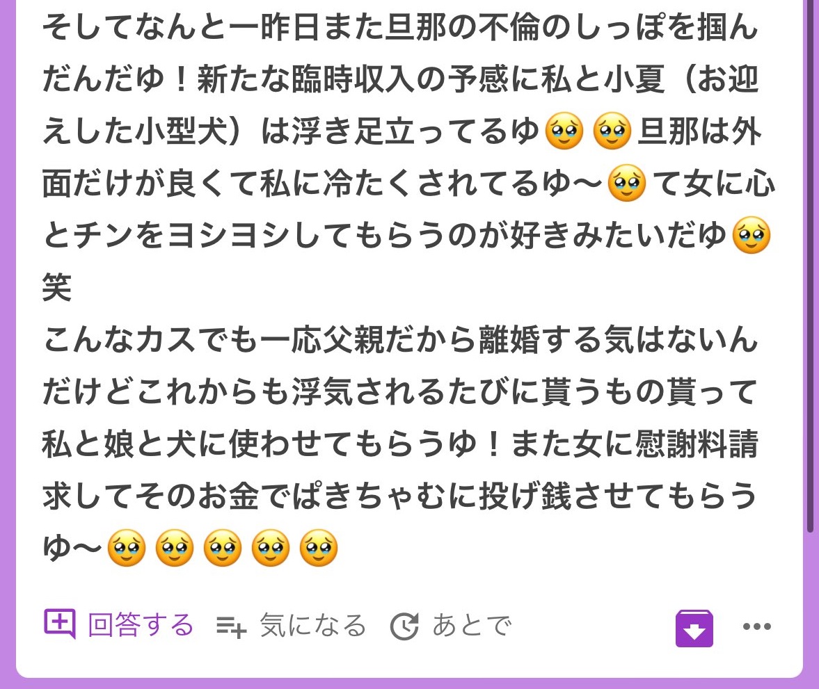 こういう文章書く程度の知能レベルだから不倫されるんじゃないすか?(名推理)