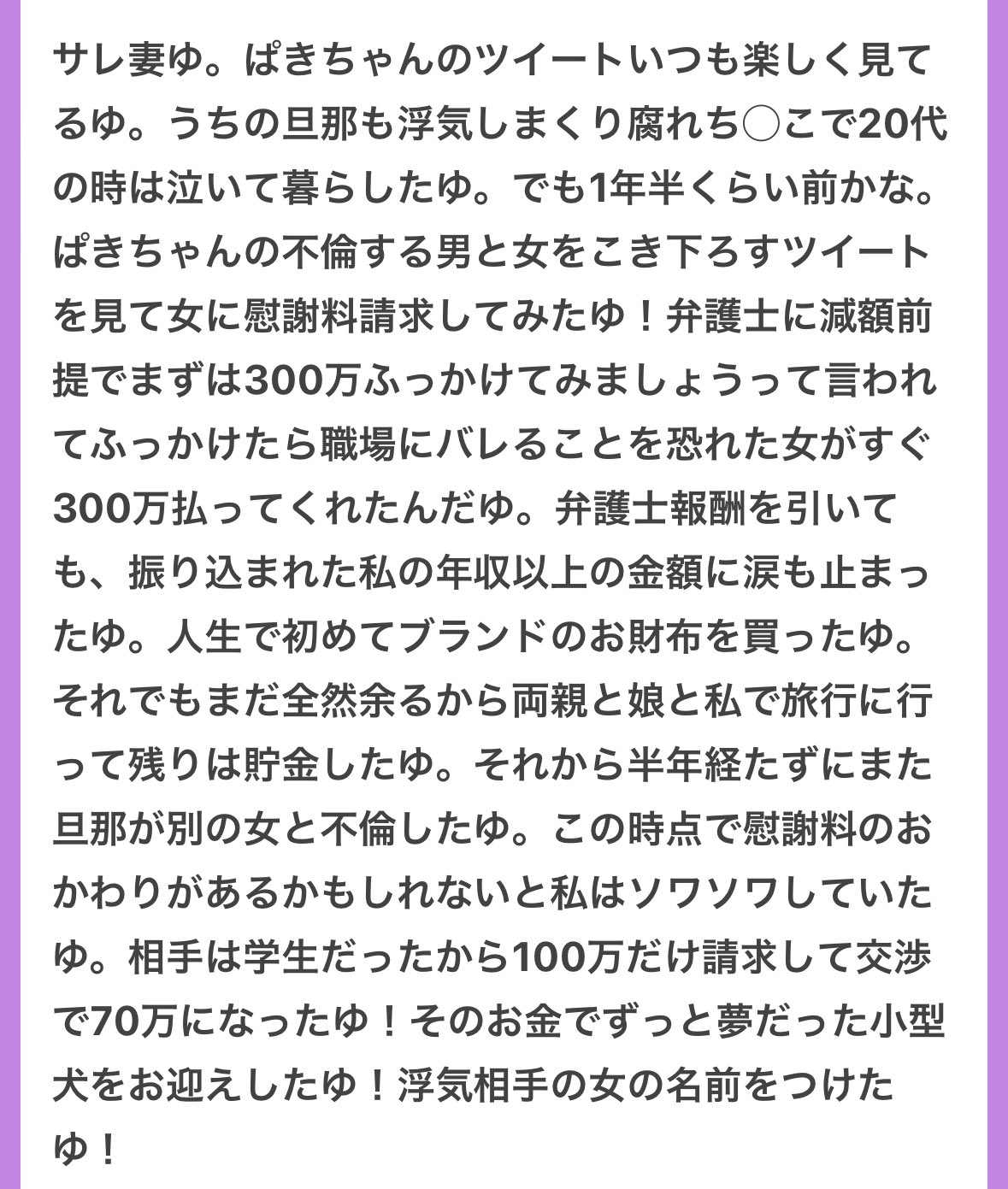慰謝料で豪遊したゆ