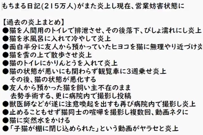 もちまる日記は猫に炭酸水をわざと飲ませるとかいう決定的な動物虐待動画をあげてるんだから、早く規約違反でBANしろよ