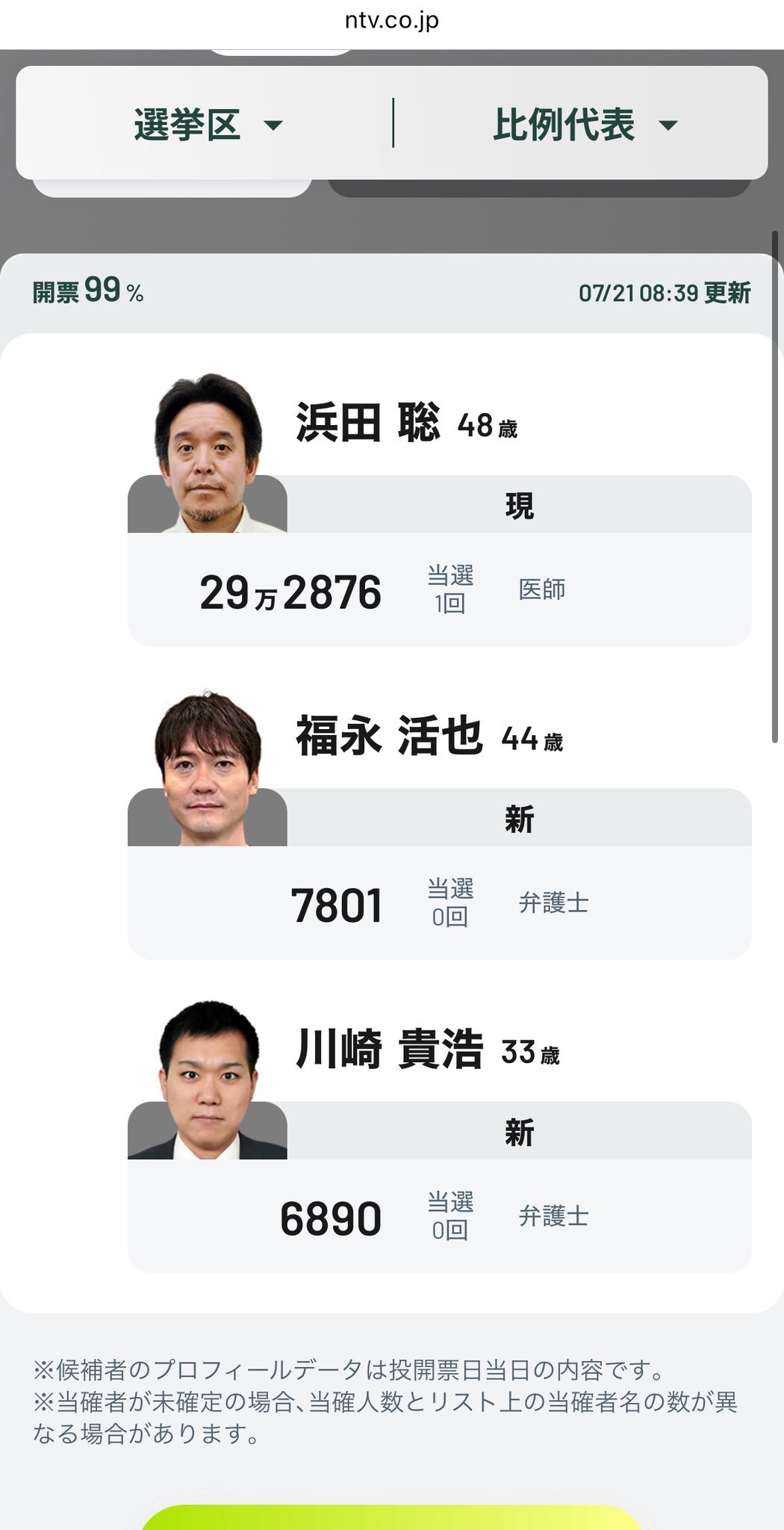 一番仕事した議員こと浜田聡が落選の模様、、、、、