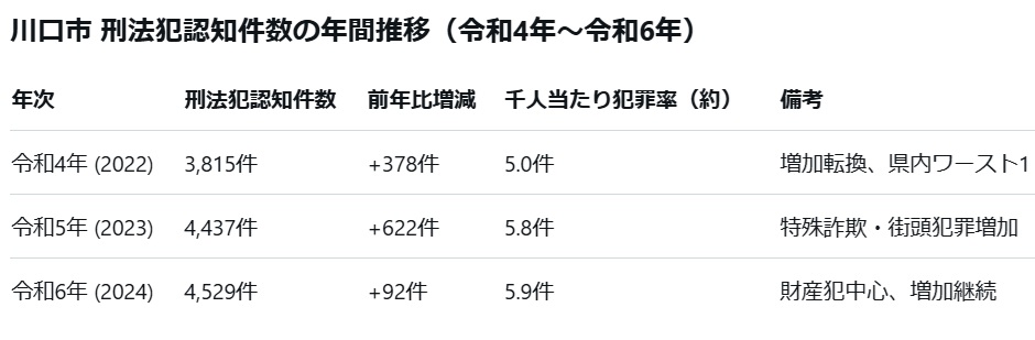 補足説明データソース: 埼玉県警察統計、川口市公式サイト(犯罪データPDF)。