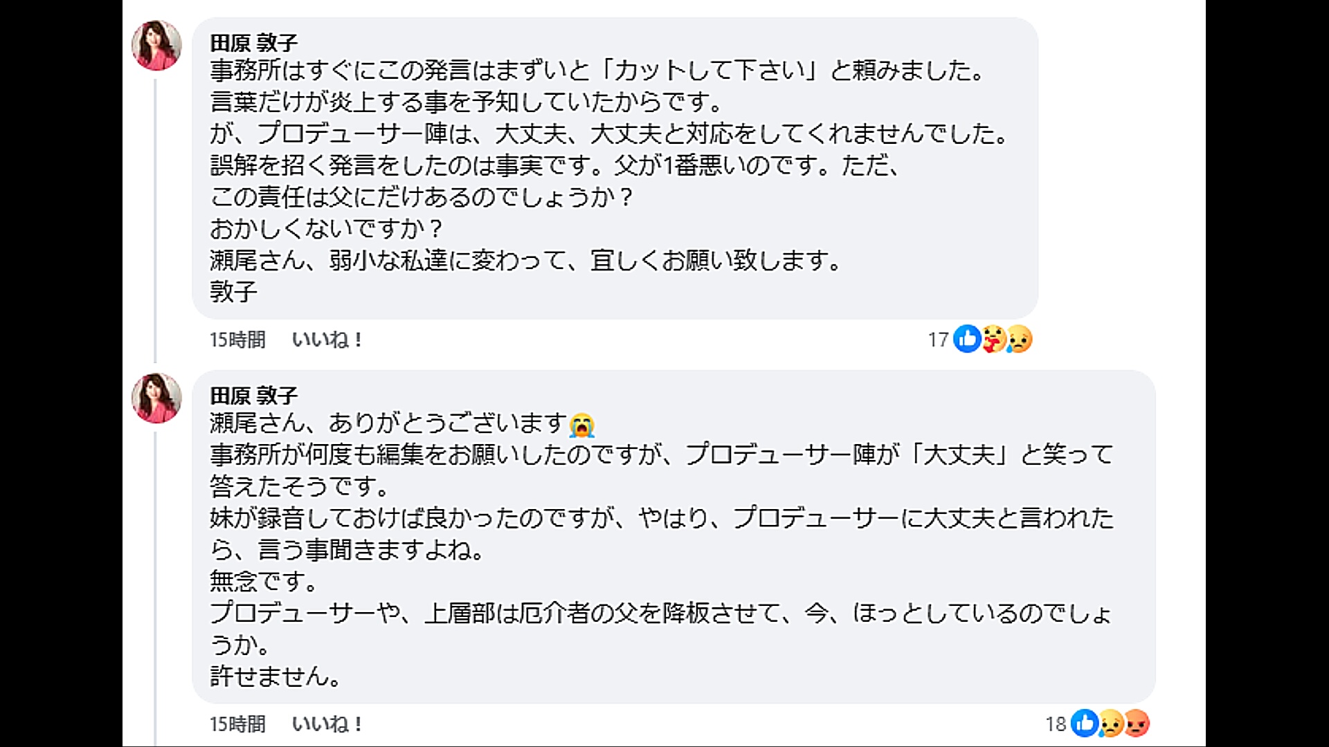番組にも責任あるが少なくとも問題発言をした人の身内が番組を責めるのは理解されないと思うぞ