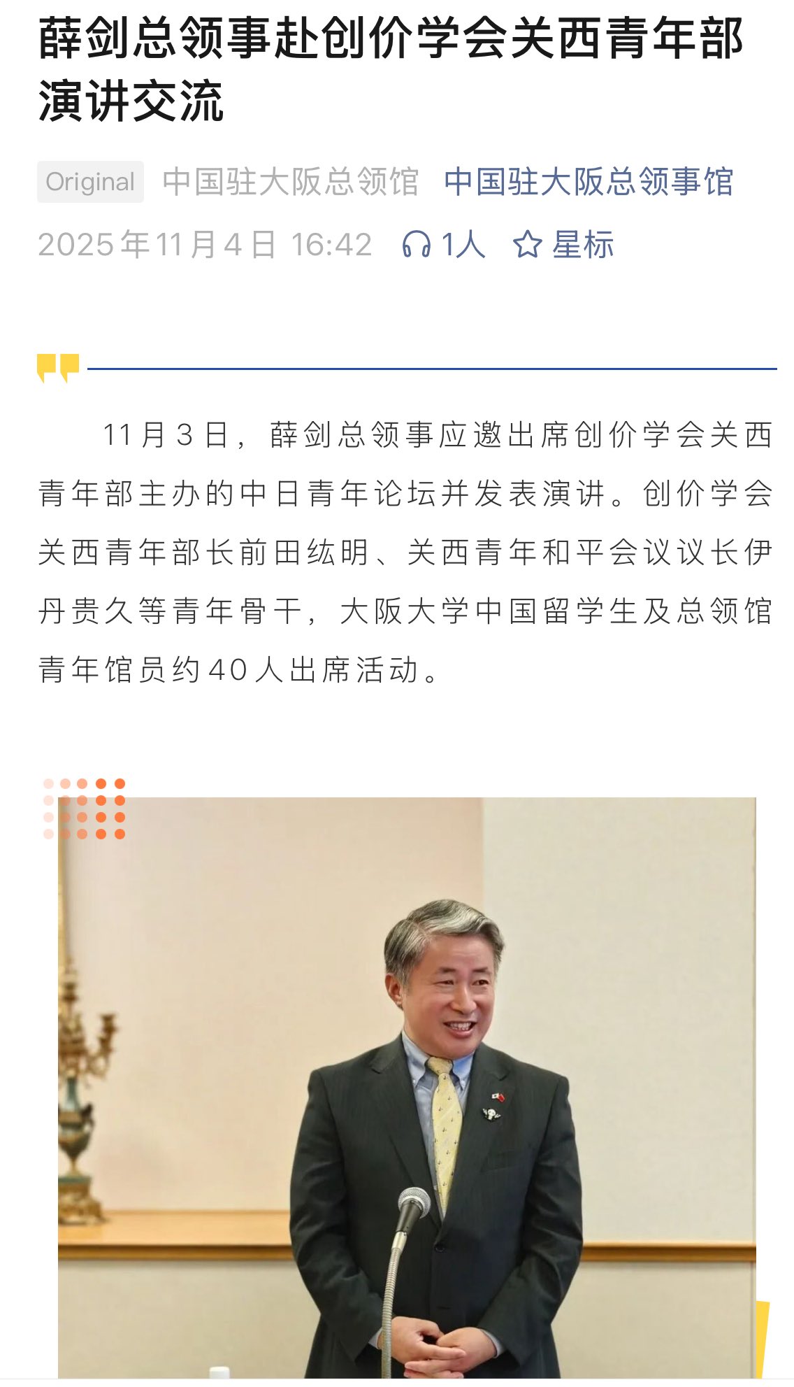 11月3日、薛剣総領事が創価学会関西青年部のフォーラムで講演していた。