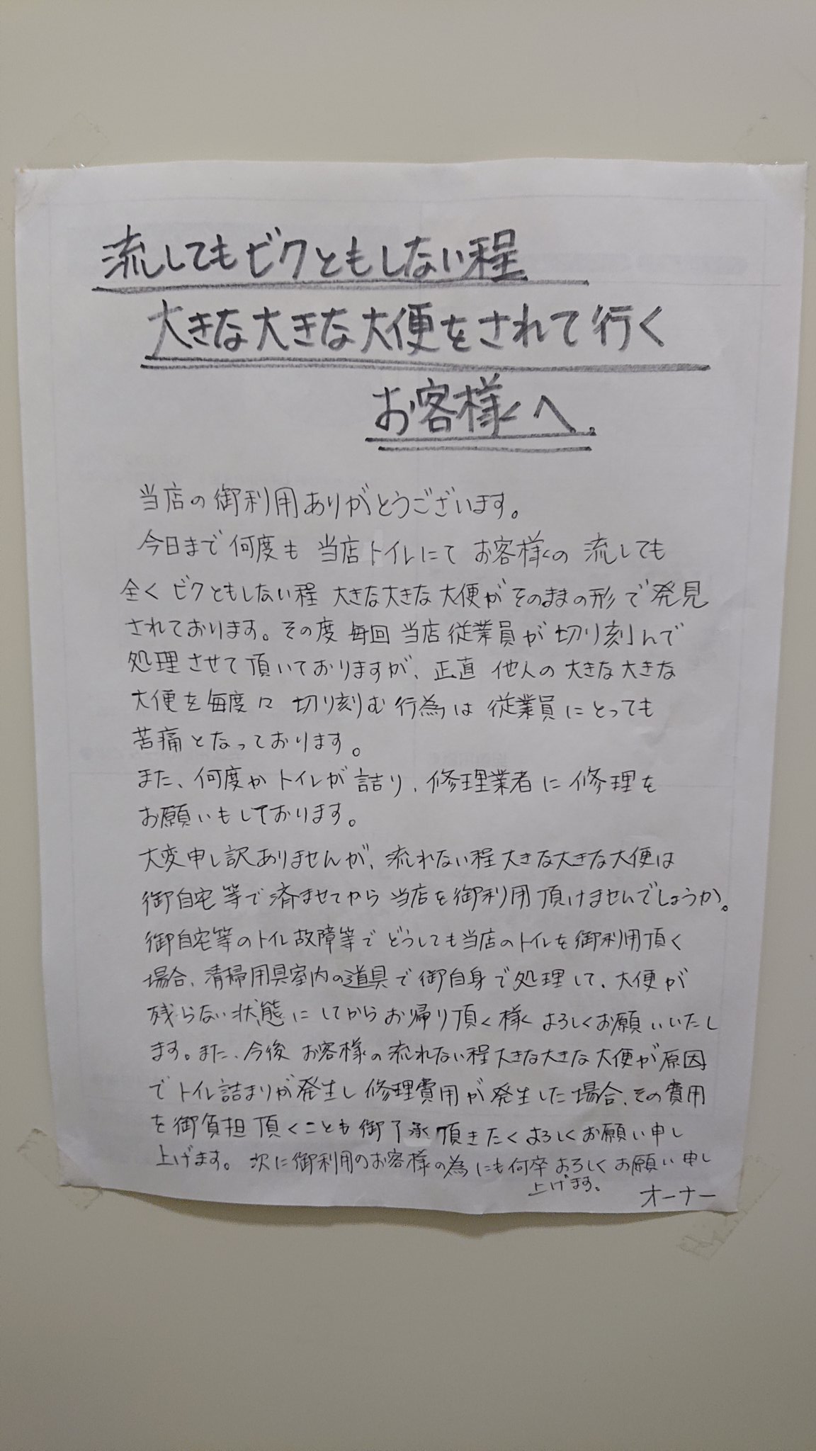 後から見知らぬ他人のクソを始末しなけりゃいけない、店員さんの身にもなれよ!!!!
