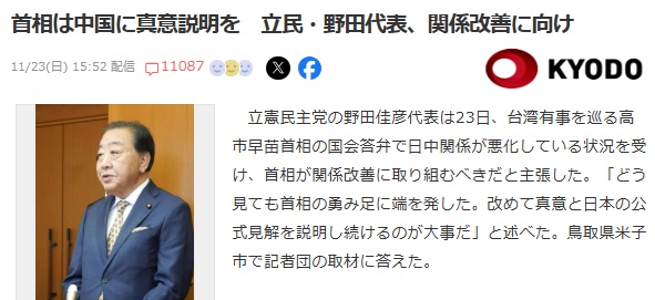 立憲民主党の野田佳彦代表は23日、台湾有事を巡る高市早苗首相の国会答弁で日中関係が悪化している状況を受け、首相が関係改善に取り組むべきだと主張した。「どう見ても首相の勇み足に端を発した。改めて真意と日本の公式見解を説明し続けるのが大事だ」と述べた。