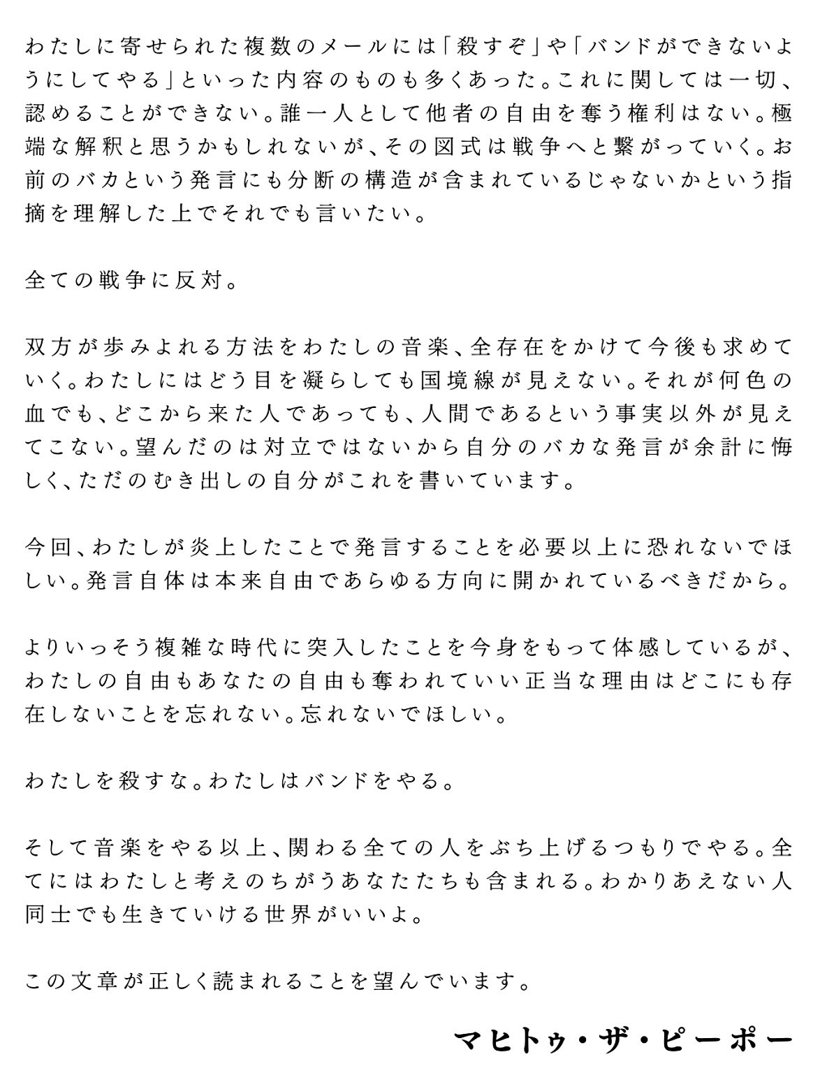 22日、マヒトゥはこれに「マジでシンプルになんでこんなバカが国のトップなの?センス磨いてやるからGEZANの武道館こいよ。前売りかいとくから(原文ママ)」とつづり、物議を醸していた。