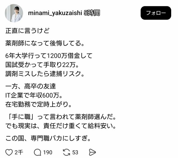 リスクはナースと似たようなもんなのにできることは医者以下ナース以下で知識は毎年更新されるレベルで沢山求められるのに捕まるリスクはナース並み医療関係者と同格、それなのに業務内容は薬関係除くと受付業務事務年寄りの話し相手、ストアに飛ばされて安い給料でレジ打ち品出しさせられてコンビニ店員みたいな扱いされる