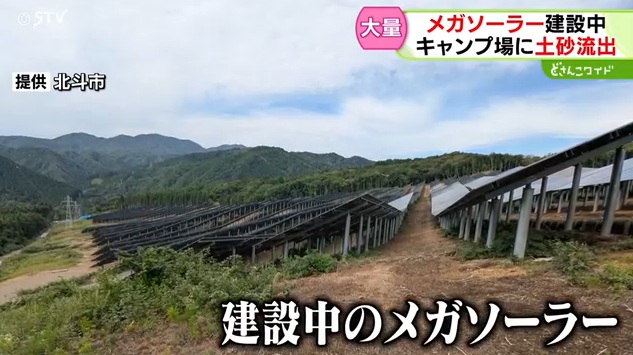 北海道北斗市の市営キャンプ場で、メガソーラーの建設工事が原因とみられる土砂の流出が発生し、そのまま放置されていることが分かりました。