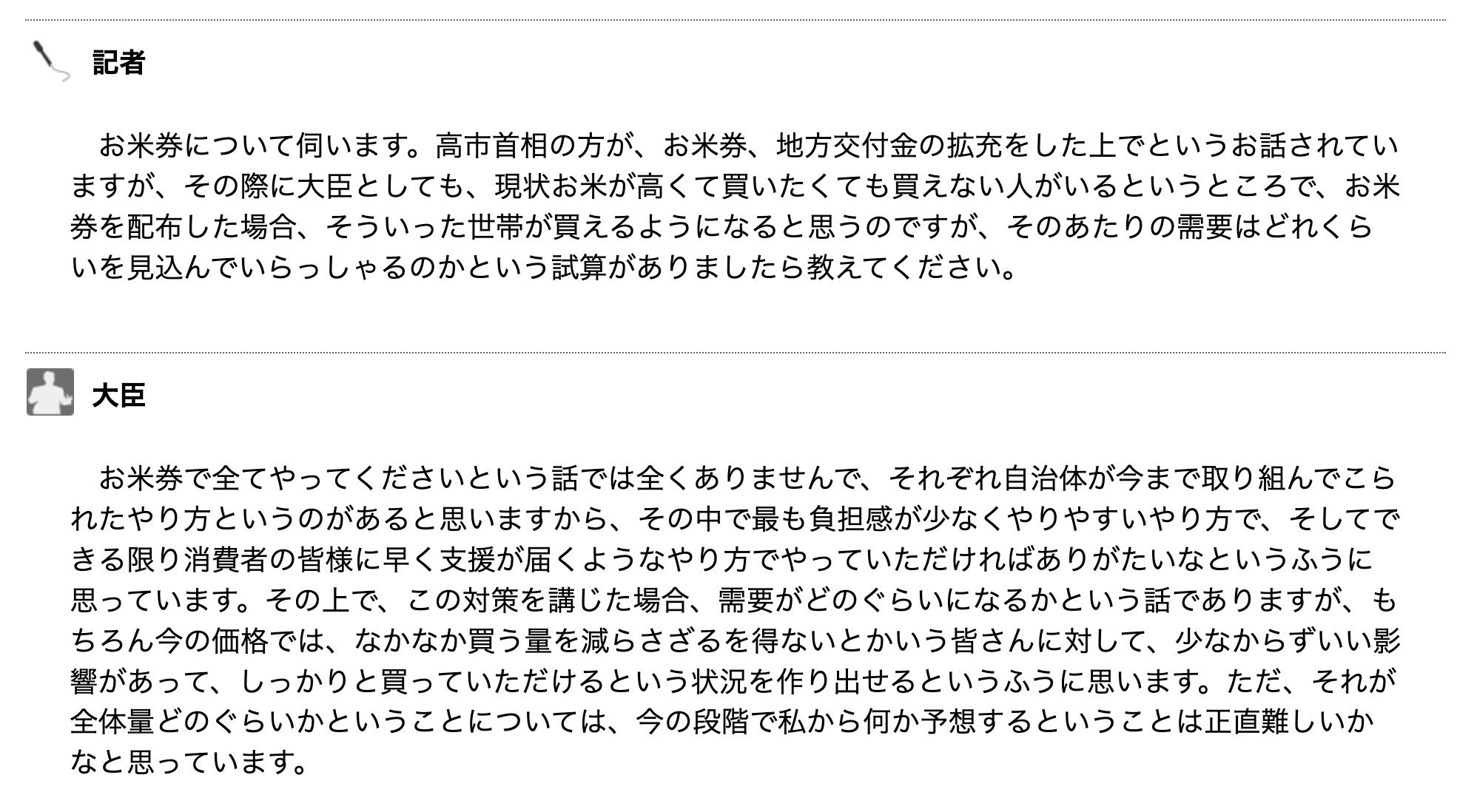 > あくまでも物価高騰支援交付金の使途一例として「例えばお米券とか…」と挙げたのをメディアが「お米券!?」と大臣叩きに走り国民が踊っただけで、大臣は最初からお米券(お米を買わせること)に拘っていません。