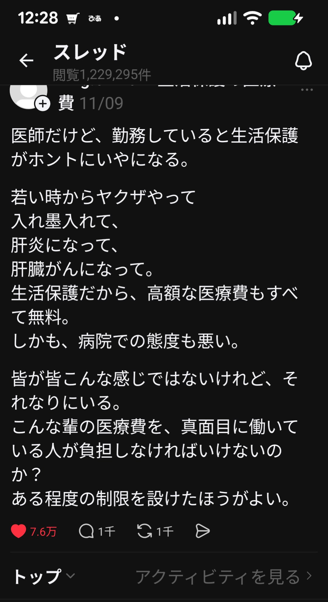 憤りとはこのことですね。無職の方とお話しする機会が多くありますが、タクシー使って、タバコ買いがてら病院行く、みたいな人多いですからね。それで、薬たくさんもらって、多すぎるから前のやつは捨ててる、みたいな。真面目に生きてるの馬鹿馬鹿しすぎる。