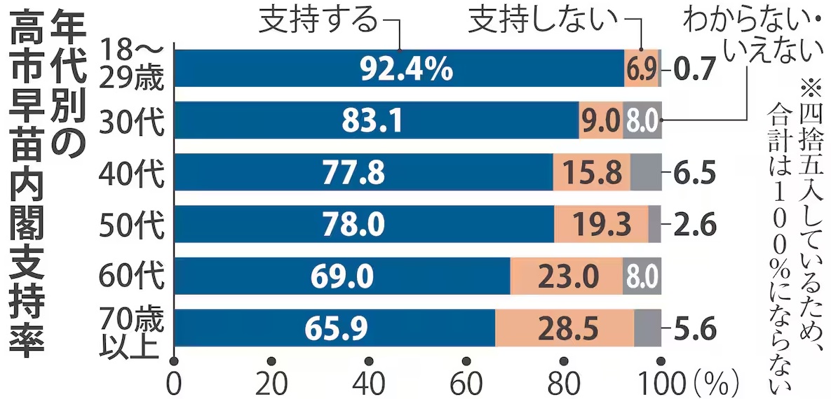 高市内閣の支持率を年代別にみると、18~29歳が92・4%▽30代が83・1%▽40代が77・8%▽50代が78・0%で全体を上回り、60代も69・0%▽70歳以上でも65・9%-だった。幅広い年代から支持を集めつつ、若年層で高い支持を得ている。