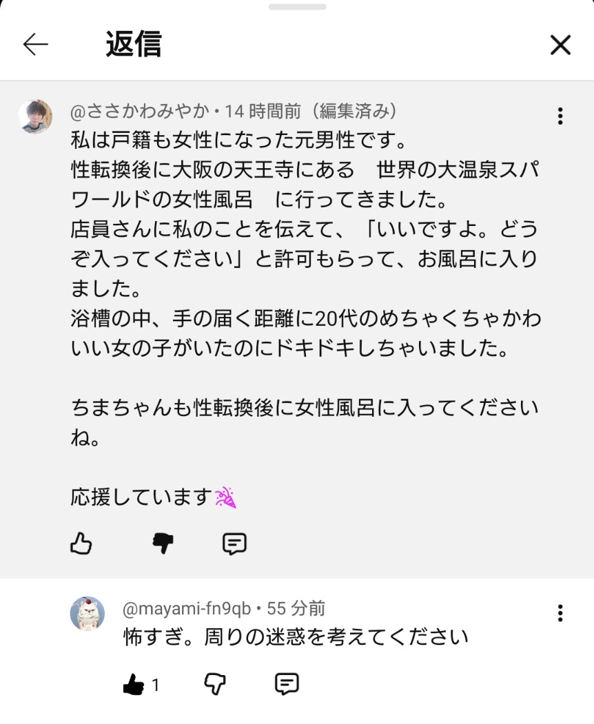 ちんちん切って女性らしくしている以上、女性専用エリアに受け入れるしか無いとは思うけど、公然とこういう発言できるモラルの低さは危険視するべきやね。