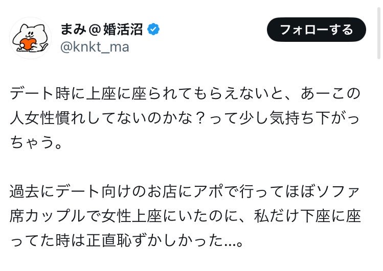 彼女を下座に座らせた時点で"非モテ"確定らしいんやが?