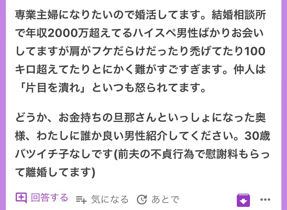 30歳バツイチ専業主婦希望の価値が、こいつの主観では2000万相当なのか