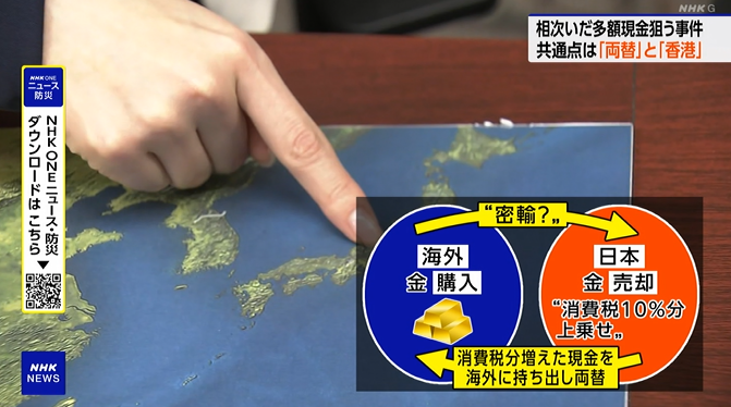 韓国から約1トン(108億円相当)の金を密輸し、東京都内の金買取店で売却 → 約9.8億円の利益を得ていたグループが逮捕(警視庁)。