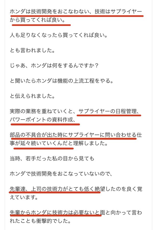 当時ハテナblogで有名になった「ホンダをたった3年で退職した」ってあの話。かなり有名になりましたよね。改めて調べて読んだけど、ホンマにまんまコレなんやなぁと。技術を捨てた企業に未来などある訳ない。 https://t.co/aBtOz7jGTQ pic.twitter.com/bpri7cTTzN