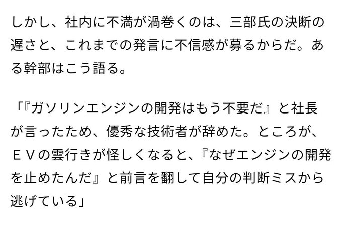 ガソリン車開発能力をかなり捨ててるので、またガソリン車で土俵に戻ってくるまでに結構年数がかかる。そこが試される数年だという話だね